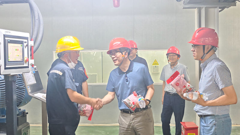 韓新偉一行深入明日新材料、新光公司等多個生產(chǎn)車間及倉庫,實地查看了員工的工作環(huán)境,詳細了解防暑降溫措施落實情況,為一線員工送上礦泉水、毛巾等防暑物資,并與員工親切交談,叮囑他們合理安排作息,確保安全生產(chǎn)。